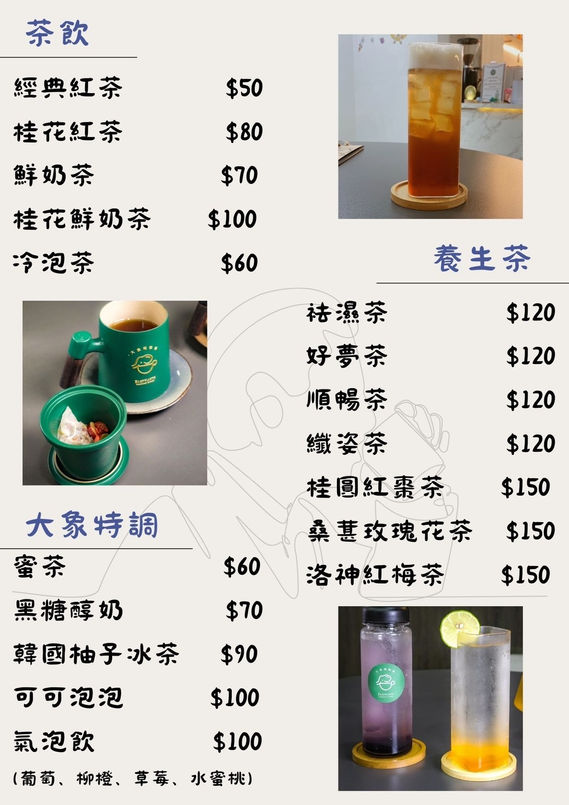 大象也有不想喝咖啡的時候,這時就可以選擇特調系列,有茶類跟氣泡飲可以換換口味。